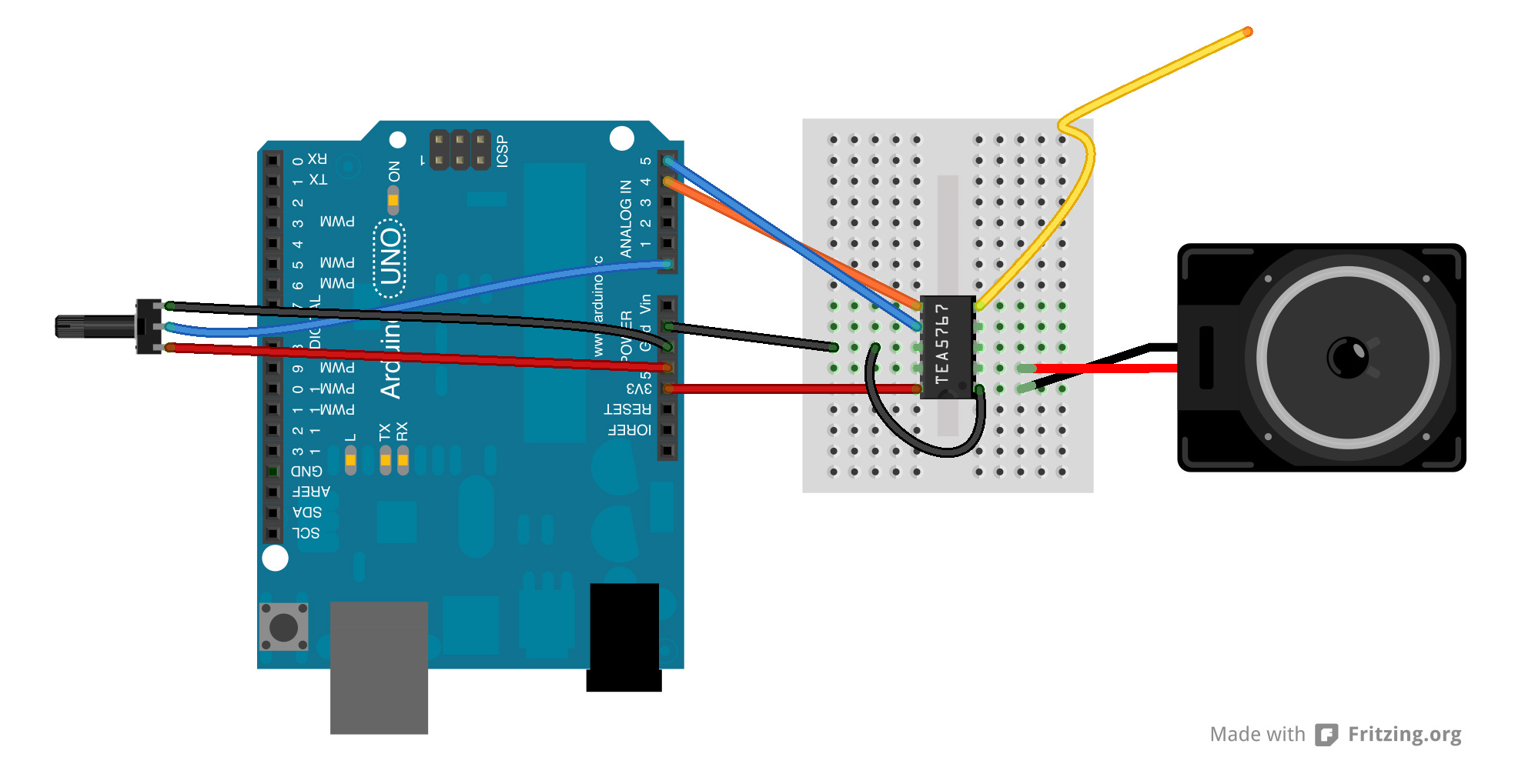 The TEA5767 can be controlled using either Serial or I2C, so it's really flexible. It's not very powerful, so you'll need an audio amplifier to hear anything. I used an Adafruit MAX98306 amp breakout that I had from a former project. I won't get any style-points for this setup, but I'm glad I got it to work almost right away. This instructable made the code part really easy. Using a 10k pot to control the frequency also highlighted that more than 10-bit resolution would be nice (for better precision) or maybe one should rather use an encoder? Good learning fun anyway. Here's a vid of it working.