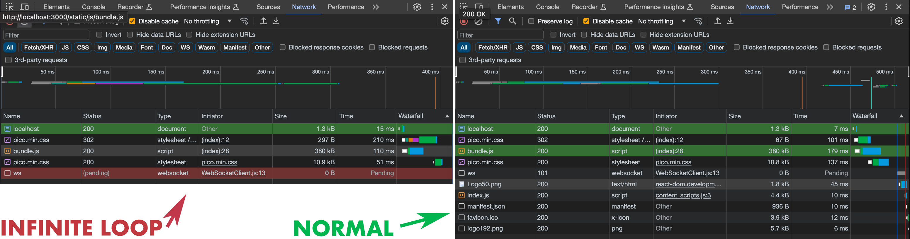 It might look like that WebSocketClient.js is hanging here, but since the Websocket is basically a request that never have to end, that’s perfectly fine. In React it’s only being used to feed back data to your IDE, so this is not the problem. The real problem is that the main javascript is loaded, but enters an infinite loop on execution.