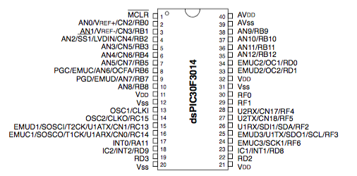 Note that these pin numbers will only be correct for the dsPIC30F4013. Other variants will need to use different pins, but you can locate these by looking at the correct datasheet.
