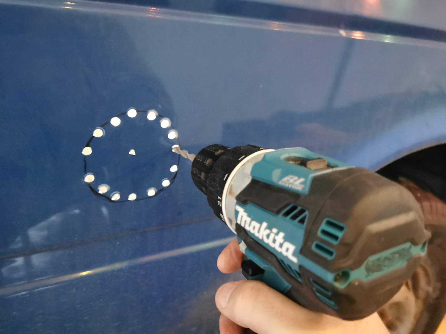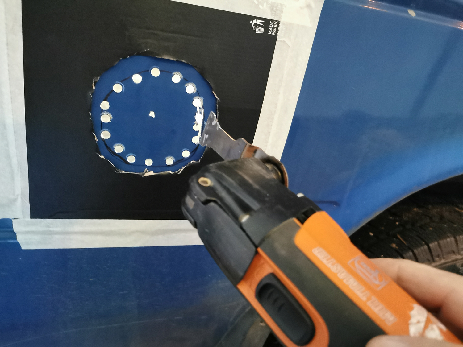 We got the parts from caravan.no and started making the first holes in our van! I first made a template of paper and used that to draw where I wanted the socket. I then drilled a series of holes and cut between them using my Fein multitool. For this operation, I taped a piece of cardboard around the hole so I could use the tool without messing up the car paint. This really wasn’t the right job for the Fein, so I changed to using my jigsaw with a metal blade instead. This gave a MUCH better cut/fit!