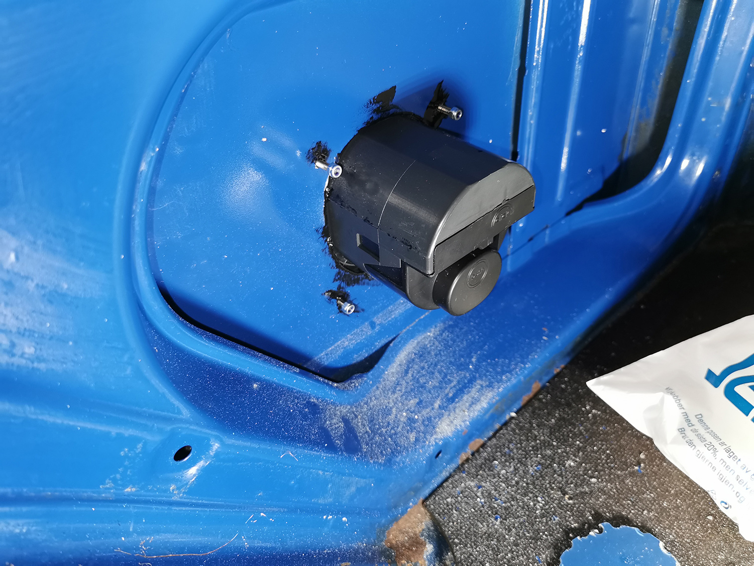 After filing the sides of the hole and drilling holes for the four mounting screws, I painted all exposed surfaces with Hammerite metal paint to prevent rust from forming. All screws use nylock nuts so they won’t come loose. I then hooked up the socket with a solid wire going stright to ground from the plug to the car chassis. If you don’t create this connection, you can create some really dangerous situations due to differing ground potentials. When we’ve done more on the interior, we’ll get an electrician to mount a small fuse box and certify the installation since this is required by law in Norway. For now, it is just hooked up to a short outdoor extension cord.