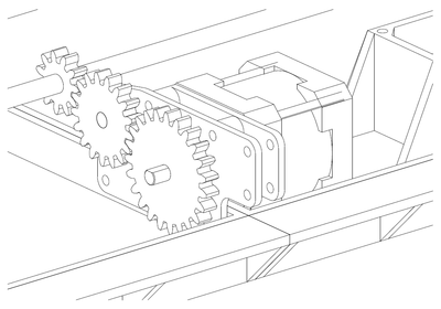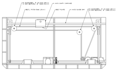 - Design work is progressively advancing. The latest design, COL-TEST-104-0, adds more detail to the X/Y gantry that was proposed in the COL-TEST-103. A method has been devised that allows a single stepper motor to drive both axial belts. This method currently relies on a drive shaft coupled with a gear train to simultaneous transfer moments (torque) from the stepper motor. See the views below.
