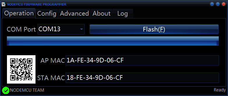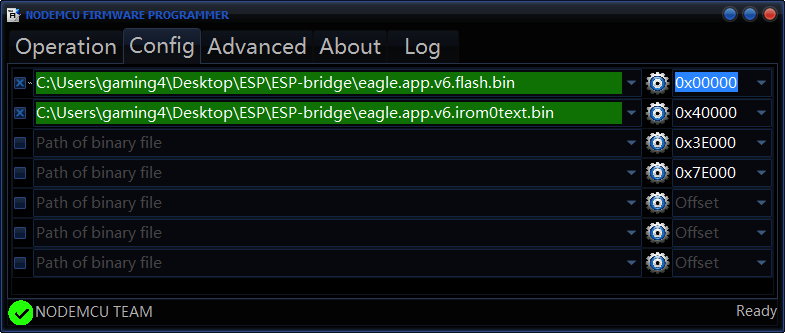Updating the firmware is quite easy if you use the NodeMCU Flasher. This has a nice, minimal GUI and everything is point and click. It’s Windows only though, so if you like Python, check out the esptool. All the officially Espressif SDK’s contain a “bin”-folder that has the precompiled files and a text description of what memory addresses to copy each .bin file into.