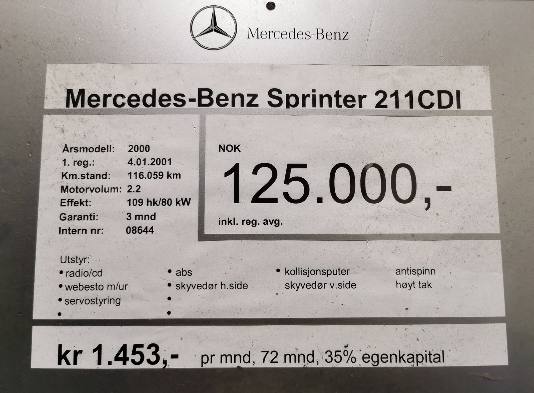 Behind the wall, we also found a sign showing the sales price for the car back in 2006 - 5 years after it was new. We bought it for $3000 now in 2020 and back in 2006 it was around $12500 and had 116.059 km on the odometer. Today it’s 203.130 km so it’s actually been running more in it’s first 5 year than it’s done in the last 15.