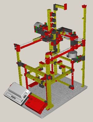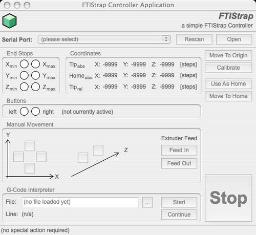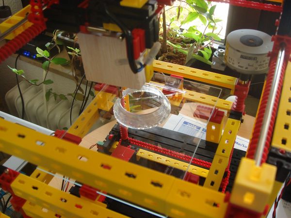 The FTIStrap is a "RepStrap" which almost completely consists of fischertechnik parts. Stepper motors are used as actuators, the interior of a hot-melt gun forms the extruder and a (removable) glass plate acts as the base to print on. A fischertechnik "Robo Interface" together with an extension module (both running in "online mode") control the steppers and scan the end stops - they can be connected to an IBM-compatible PC running Windows or Linux or an Apple Macintosh running MacOS X. The FTIStrap is completely "host-controlled" - a small application running on the host can be used to either manually operate the machine or load and interpret a file containing the "G codes" for a RepStrap.