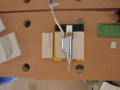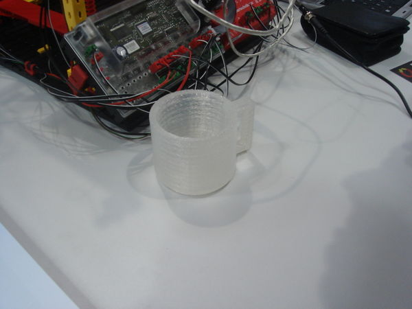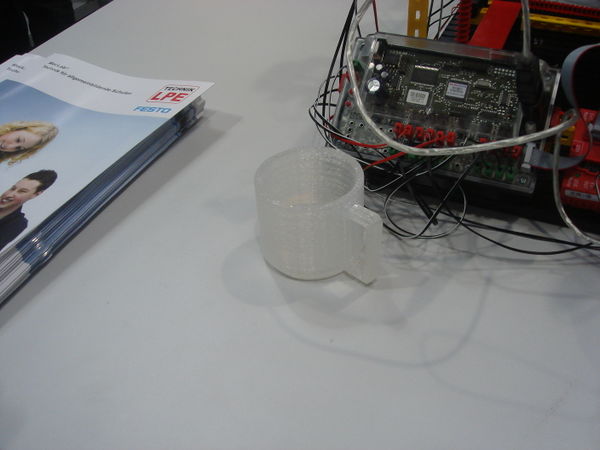 The hot-melt gun which is currently used needs cylindrical hot-glue sticks with a diameter of 7mm. The gun melts them at a temperature of approx. 230° celsius which is hold by a thermistor within the gun. The rigidity of the printed objects depends on the thickness of their walls (in relation to their size, of course): one of the first printed test objects, which accidentially got thicker than foreseen, turned out to be really rigid.