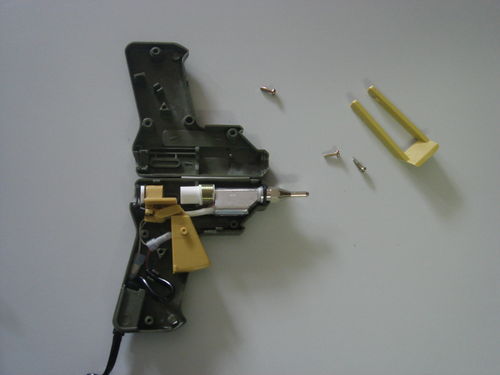 - the hot-melt gun operates at 220V and - although the cabling seems to be professionally insulated (see the pictures below) - handling close to the cables might be dangerous!