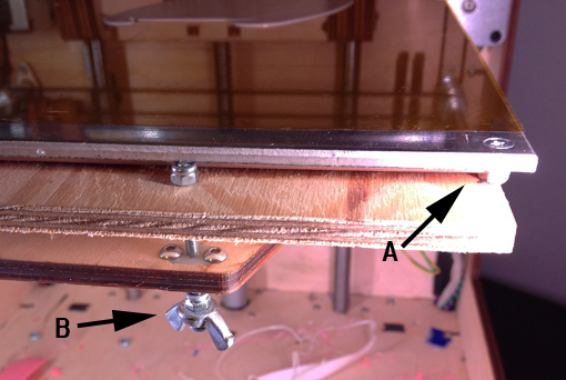 Note that the leveling screws (B) are at the bottom of the bed, making it easy to tweak the platform height while a print is running. This takes about 1.5 cm off the maximum height, but it’s easily worth it. A stop-bolt and a wing-bolt is attached to the bottom of the levelling screws for easy adjustment. The screws that attach the aluminium and PCB to the plywood (A) are counter-sunk into the aluminium, so there is nothing that the print head may hit.