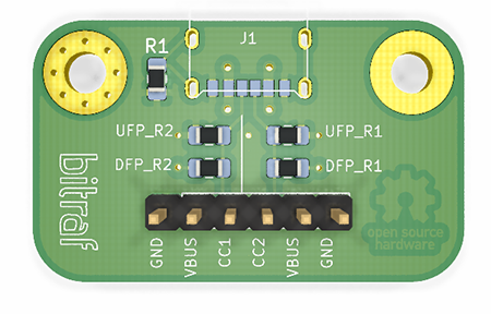 If you are making a Device that needs power, it’s called an Upstream Facing Port (UFP). Configuring a UFP is quite simple. Just use a 5.1kΩ resistor to pull down CC1 and CC2 to GND. That will make the Host see this as a device. This board will let me test if this is sufficient to supply power.