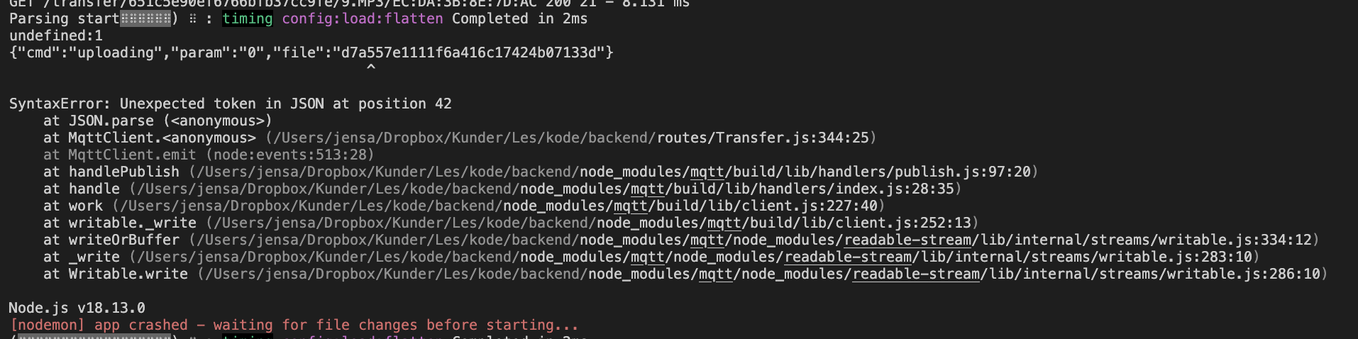 I instantly tested the JSON with JsonLint and it was all valid JSON. So how could this happen? The string was sent from my Node.js backend to an ESP32 device and back as an MQTT message. After an hour of not getting anywhere, I asked on X and my friend Jon spotted the culprit after looking closer at the Buffer with the MQTT message. Somehow, the buffer contained a backspace character? How did that happen then?