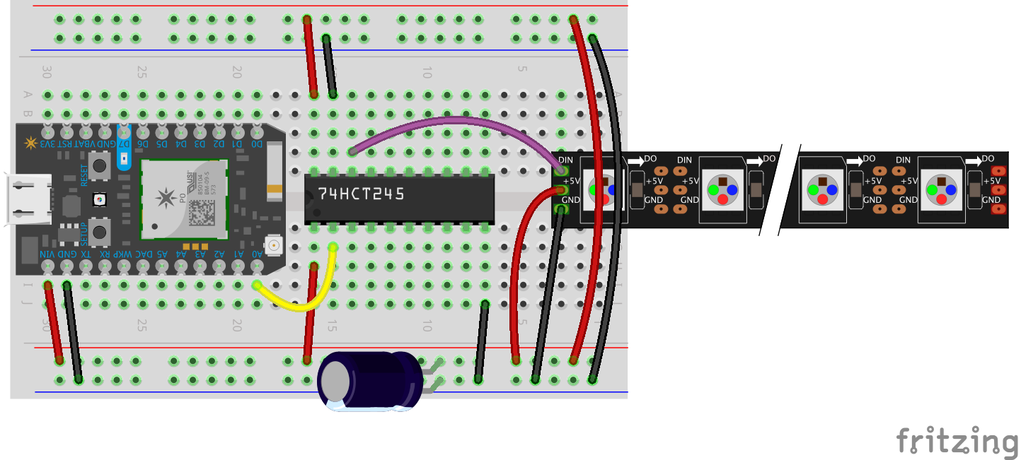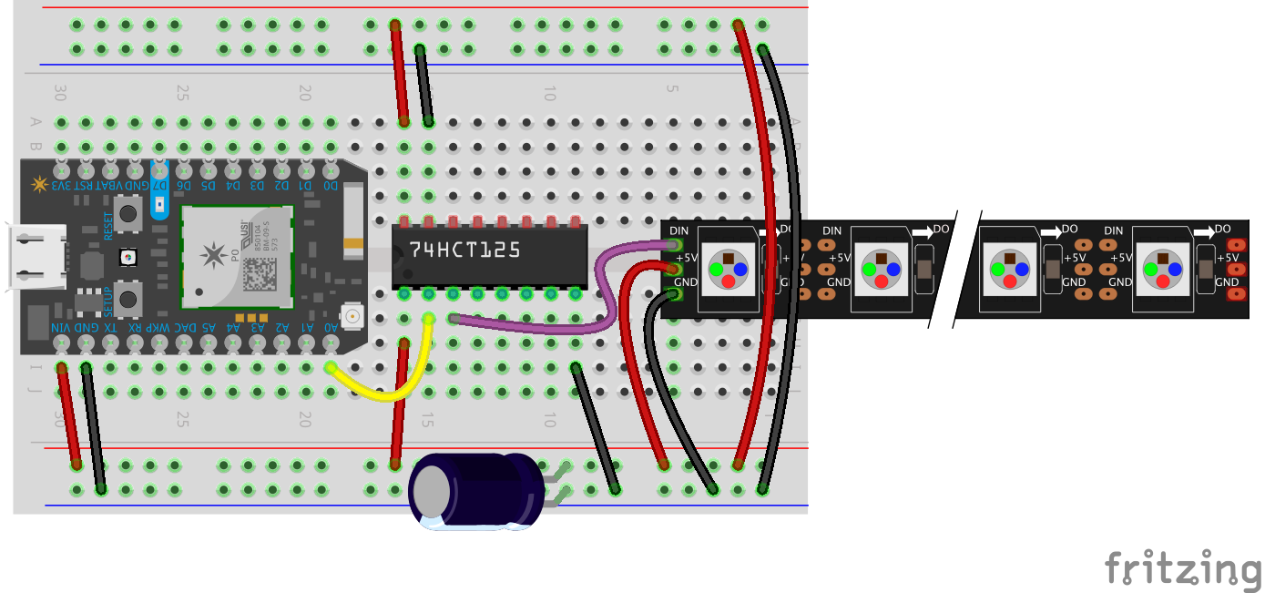 Yellow wire is data out from the Photon. Purple is the level shifted data signal. Red is 5V. Black is GND. Do not omit the fat Capacitor that feeds the fast PWM LEDs.
