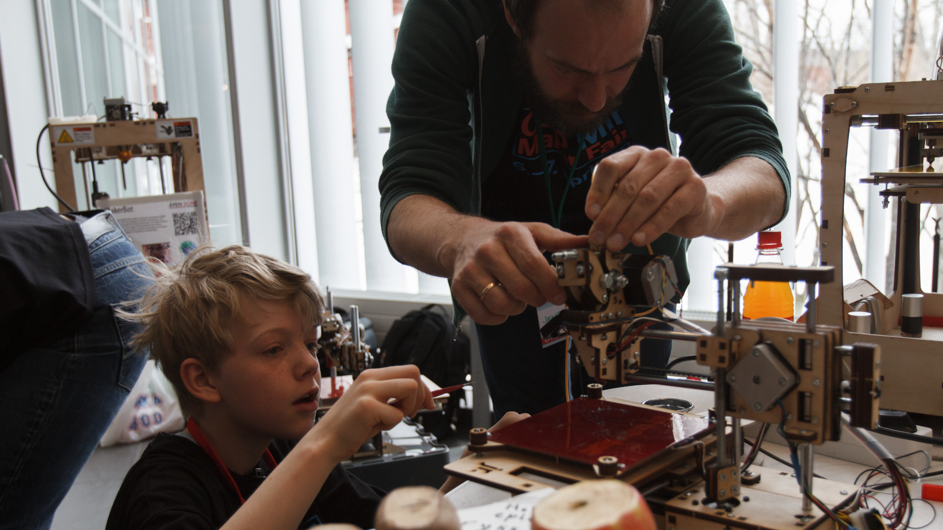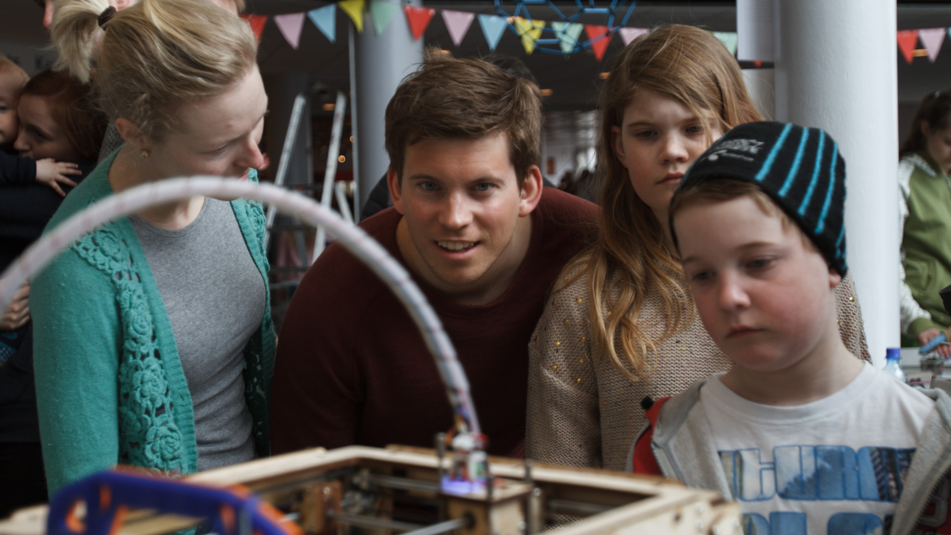 Walter inspecting a print while Elias Bakken is showing off his Hipsterbot in the back.