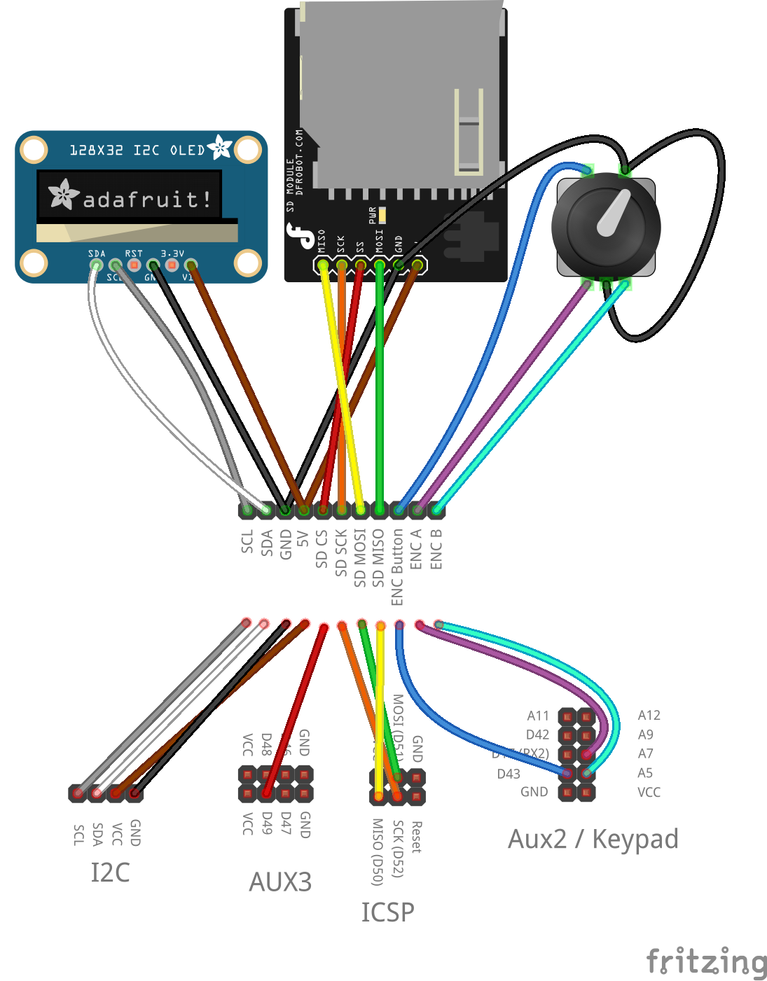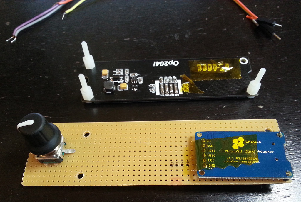 The SD card reader was something I had picked up from DX a long time ago A straight SD reader based on SPI. I got the encoder from Adafruit and I found a standard buzzer that was fairly small in a drawer. Pretty much any screen, SD reader, encoder and buzzer can be used.