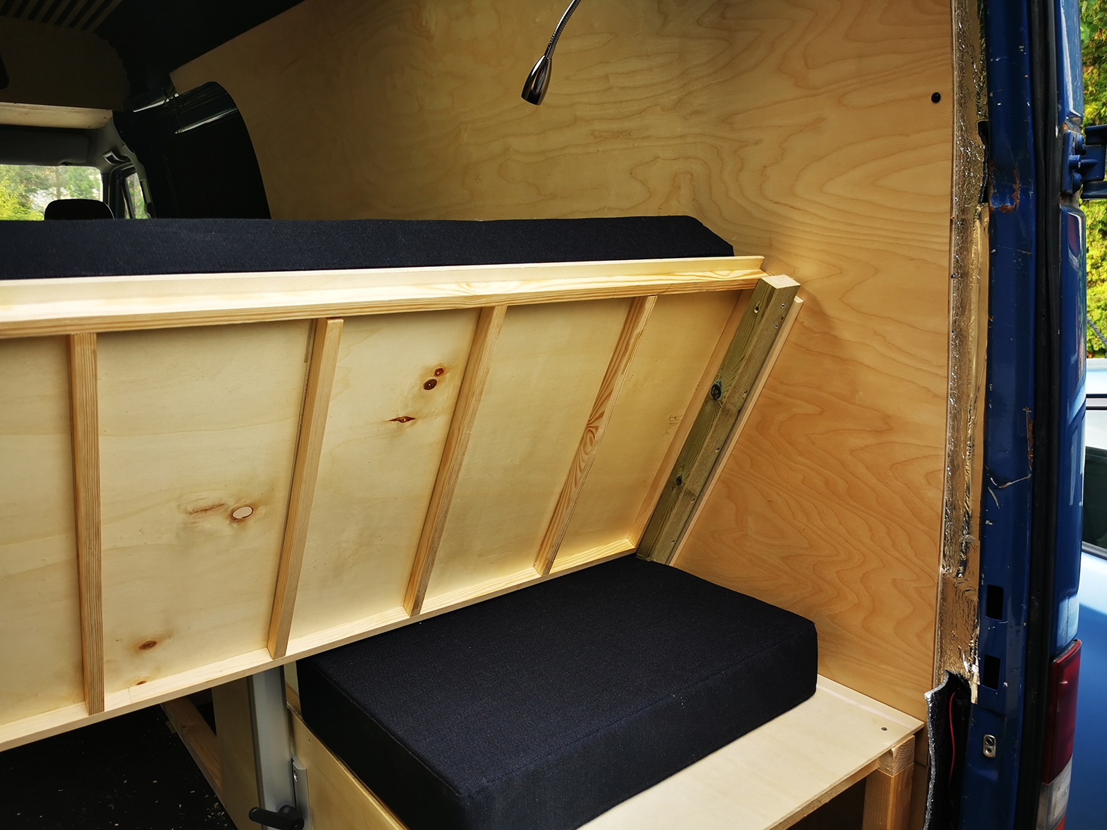 I also made a table of three glued layers of ply with birch on top and poplar at the bottom to save weight. The table is on a Lagoon mount, so it can swivel in all directions as needed. Here’s how it looks with the first two mattresses in.