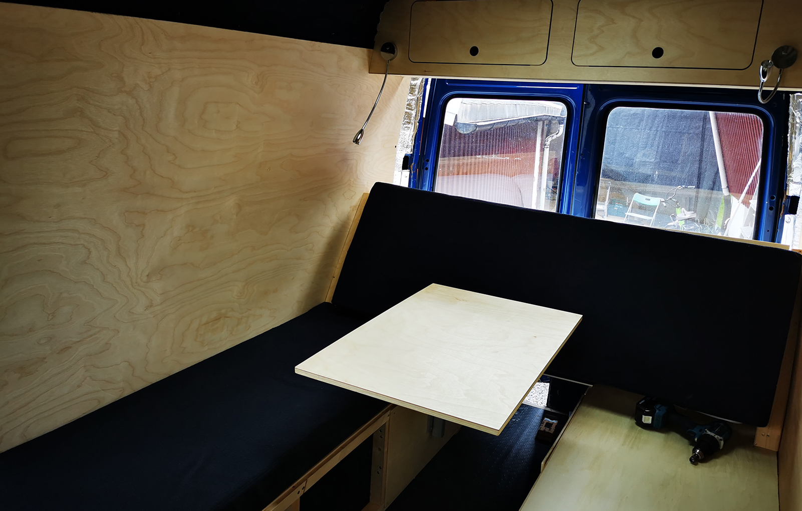 The reading lights work great! If you don’t need them, you can just point them upwards, but they’re the right angle if you want to read. They also have builtin USB chargers for convenience and they dim. After this, I got started on the kitchen setup. It’ll hold a Dometic top loaded fridge, our water system, a sink and a flip-top that hides the cooking area. We’ll use a portable burner so we can cook outside if the weather is good.