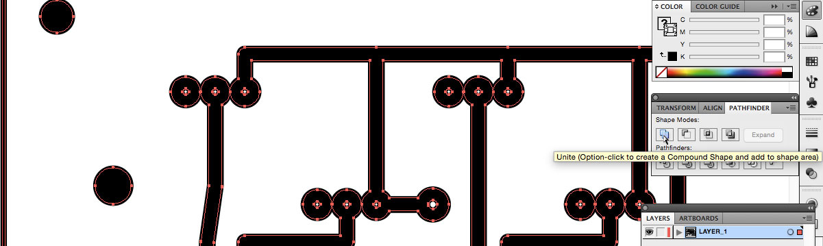 Then merge all the vectors into solid shapes so that we can follow the outline to cut the trace out. Remember to copy the holes onto a separate layer before merging, so you have what you need for drilling the holes. I usually use the “Outline stroke” feature to turn lines into fills and then I’ll use the Pathfinder panel to Unite all the connected/overlapping vectors. Illustrator does this in seconds, but Inkscape can take 15 minutes for even simple boards.