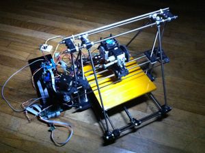The machine uses M6 threaded rods and M3 nuts and bolts (as opposed to the M8/M4 used on Mendel) and NEMA 14 Stepper Motors. The reprapped parts are about 30% of the volume of those for Mendel, which is to say it could reproduce three times faster.