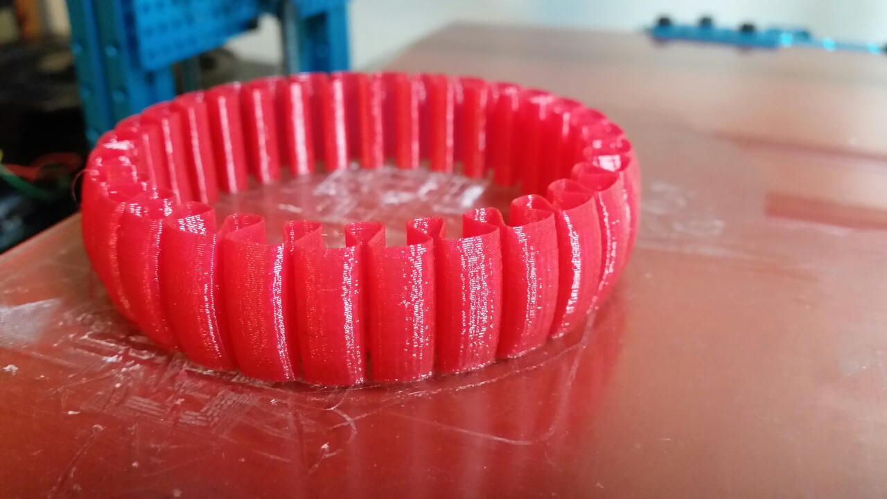 I can't quite get over how solid objects printed with NinjaFlex are. They're soft in that they can be curled together, but will regain their shape easily. If you print a single wall of NinjaFlex (0.4mm thick) it will take a lot of force to tear it apart. My first print was exactly that - a single wall stretchlet.