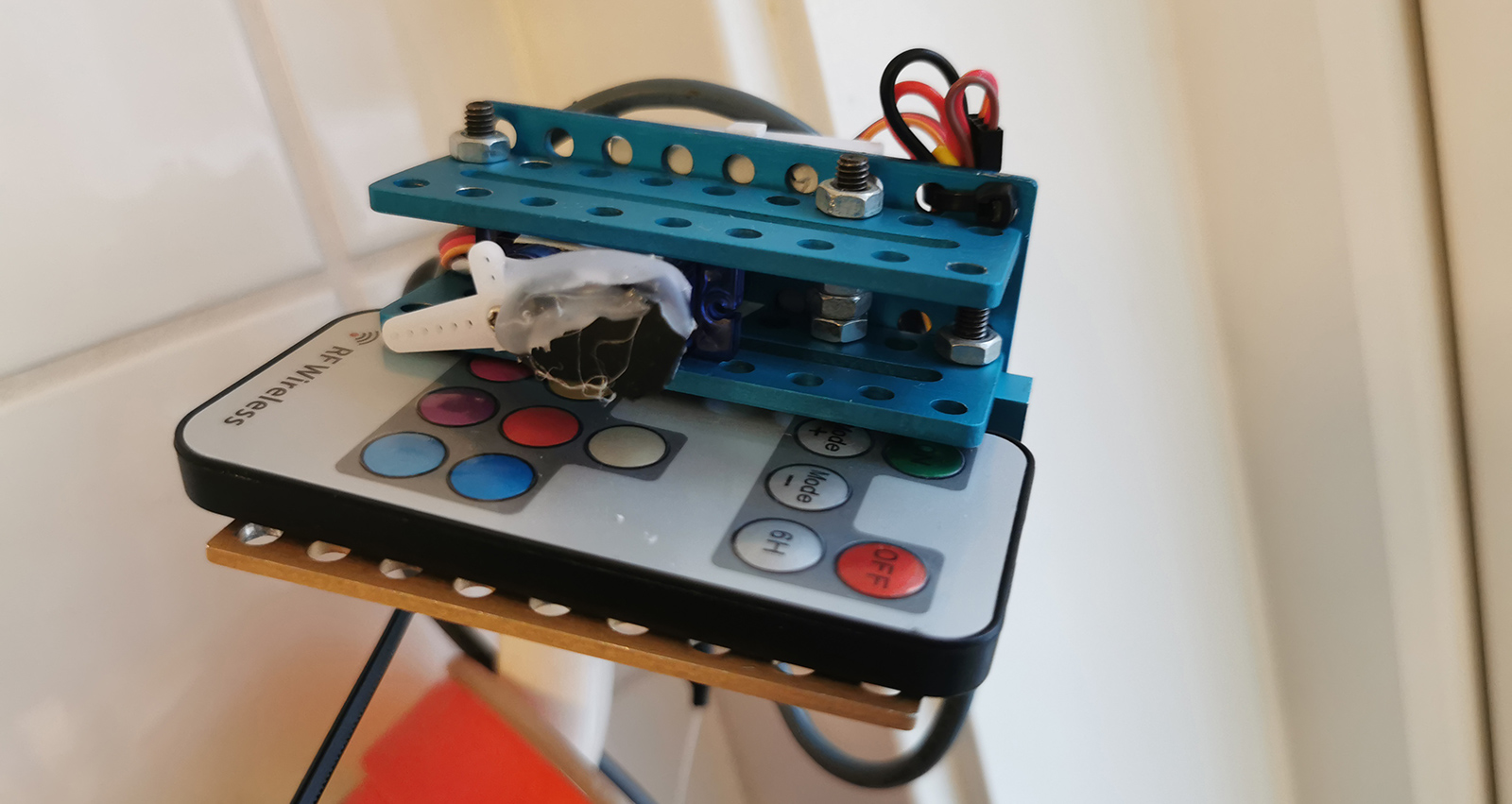 I jerry-rigged a Particle Photon so it would twist a small servo so it hit the remote control. The servo had a rubber pad stuck to it using Hot-glue. This made sure the hard servo-arm would not destroy the remote completely. It wasn’t a pretty creation, but it got the job done and I spent less than an hour making it.