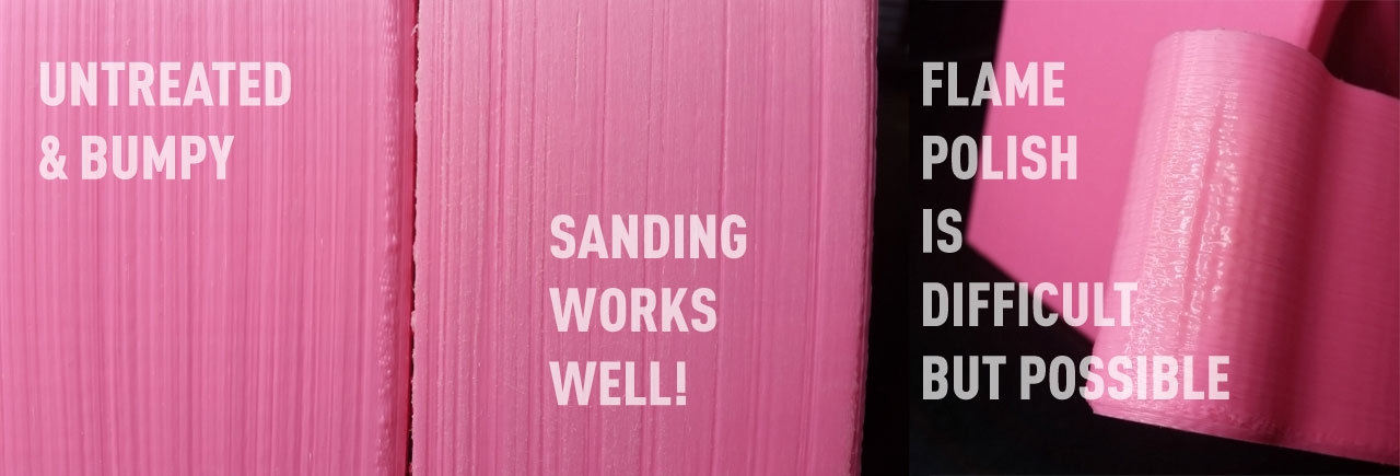I also tried flame polishing the material. It does bring out a gloss but it's extremely hard to not apply too much heat. Since the heat builds up inside the material, I managed to get what looked like a perfect finish, but then after a few seconds it looked like above. The heat in the material kept melting it… I also tried to treat it with acetone, but it has no visual effect. It does however seem to dissolve the plastic to some degree.