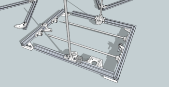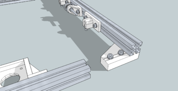 The Mendel's Z belt would bind and skip easily because it had a convoluted path and was hard to tension properly. However, a timing belt is an appropriate way to synchronize two gears. By forgoing the belt, the Prusa Mendel design introduced it's own problems, such as coupling the motor shaft to the leadscrew. The Prism design keeps the timing belt of the Mendel, but simplifies both the belt path and the tensioning. A smaller belt could make the path even simpler.