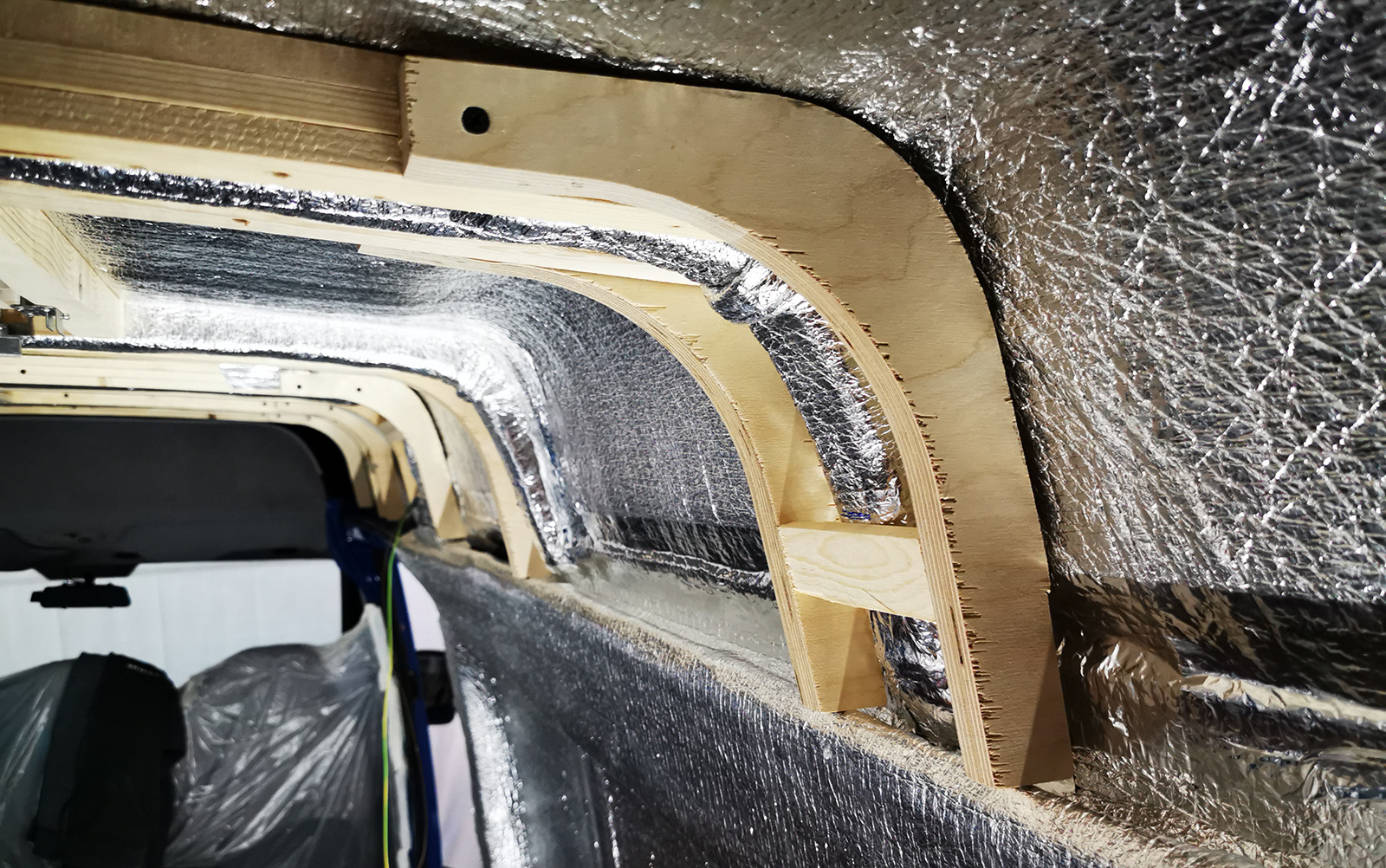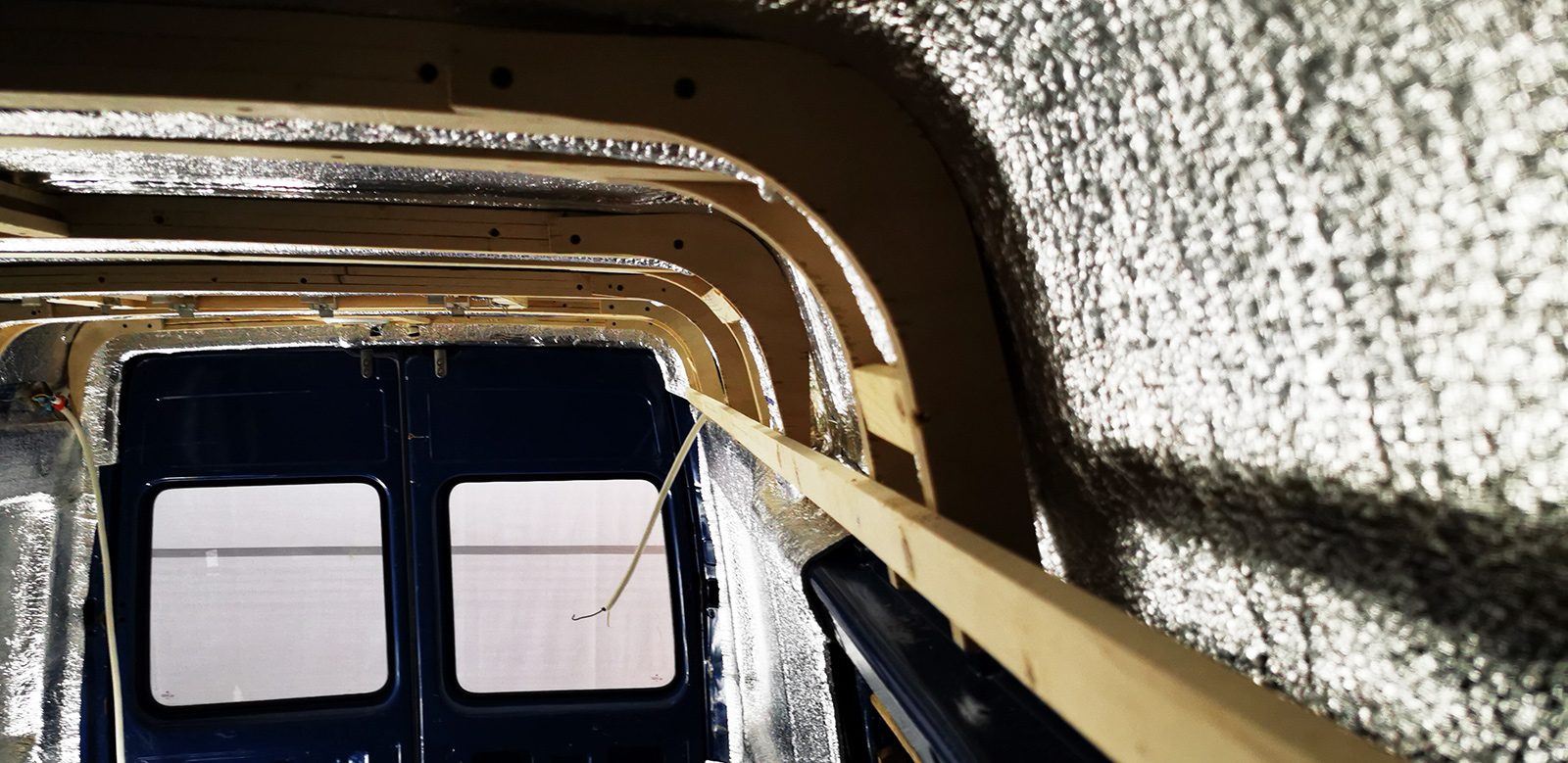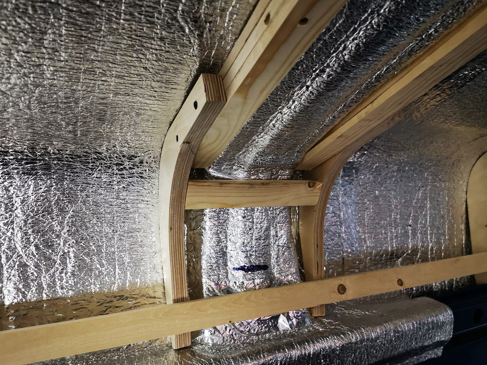 All the walls of the van are now insulated and all cables are in place. This week we’ve prepared the roof by mounting wooden beams onto the structural beams in the van. These will easily hold the load of me, so several of them will make for a solid roof build. We used three layers of 11mm pine so that we could bend the wood to follow the slight curve of the roof.