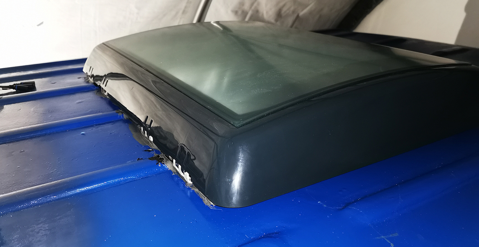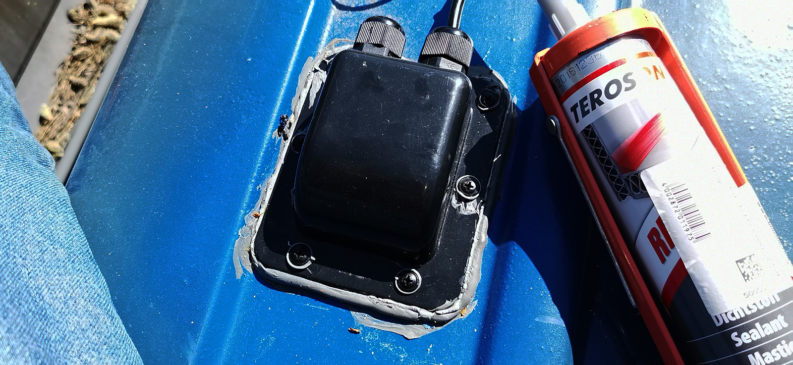 Finished hatch. Now secured and (hopefully) waterproof! We also fixed the outtake for the solar panels and pulled the cable for that. For both, we used Teroson RB 2759 for waterproofing.