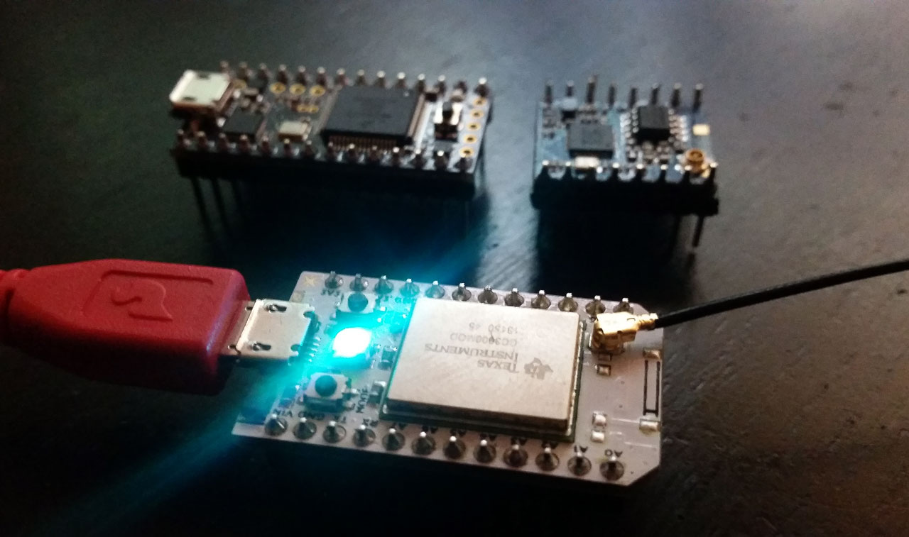 Nice to have both wifi and MCU on one vs two boards! Teensy 3.1 with an ESP8266 in the back, Spark Core in front.