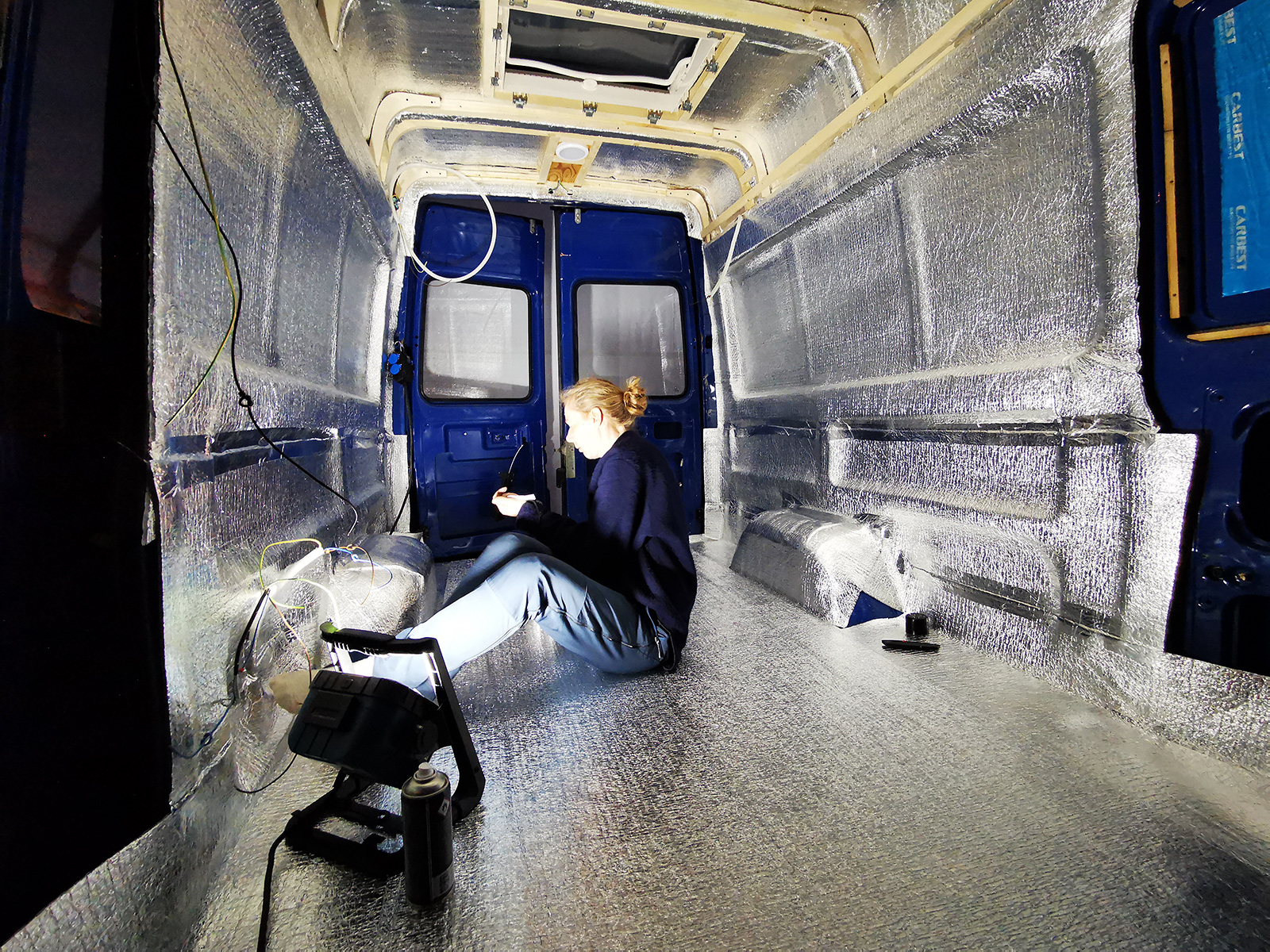 My primary concern with the car has been to avoid moisture, so we wanted to retain a moisture barrier across the entire car. We’ve used Low-e and alu tape as this is a proven solution. Van floors are basically just sheet metal with a plywood board that is fastened using rivets. If you remove this floor, you’ll expose 30-something rivet holes that go straight to the moist underside of the car… So my idea was to keep the 12mm plywood, insulate over that and then put in a new floor on top of that. This will loose us some height, but I cannot stand upright in the finished car anyway. I’m 1.88cm (6"2’) but my wife still has good clearing to the roof.
