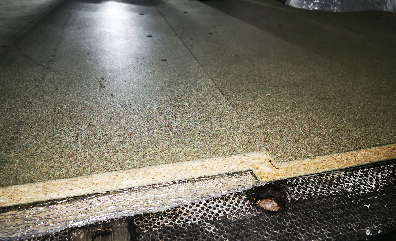 Next, we added in the floor boards. I had a hard time finding anything thinner, so we ended up using 22mm floor boards that are moisture treated to be used on bathrooms. This thickness adds quite a bit of weight, but it was all I could find at the time. Covid & lockdown has made these things more difficult, so we had to go with what we could find. If I could choose, I’d use something half the thickness.