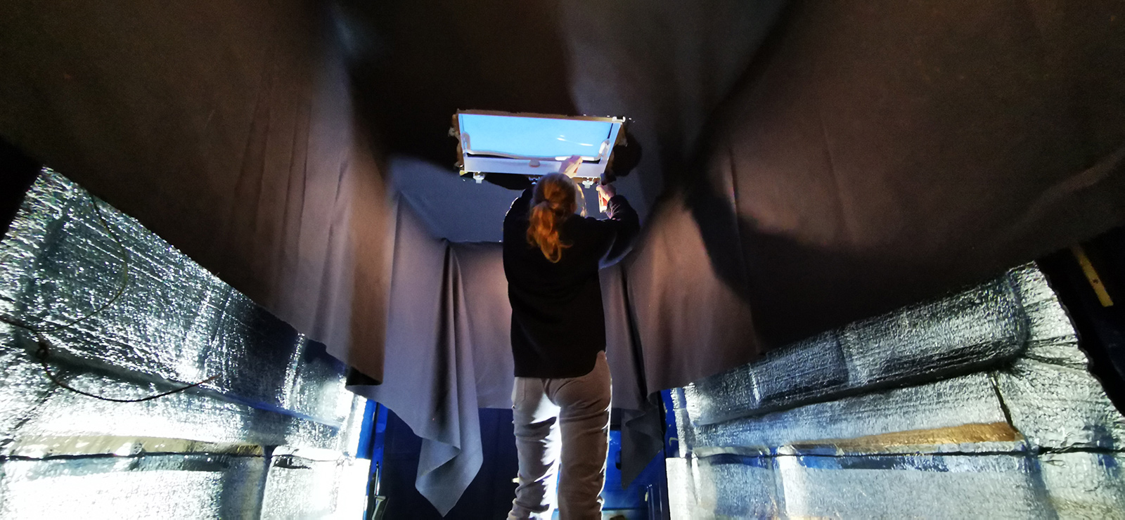 We fixed the skylight to the roof some weeks ago, but to place the final frame around it, we had to get started on the roof. The first textile we got was a black, woven material that did not stand up to a fire test. It was claimed to be fire proof, but it caught fire easily and based on how molten plastic was dripping from it, there was plenty of plastic in that mixture. One week later we picked up a thick, felt-like material. This is the same that is used in the traditional Norwegian “bunad”, so it’s pure wool and won’t catch fire. The thick felt is currently held up by staples, but we’ll remove those as we add the wooden ribs that’ll go across the roof.