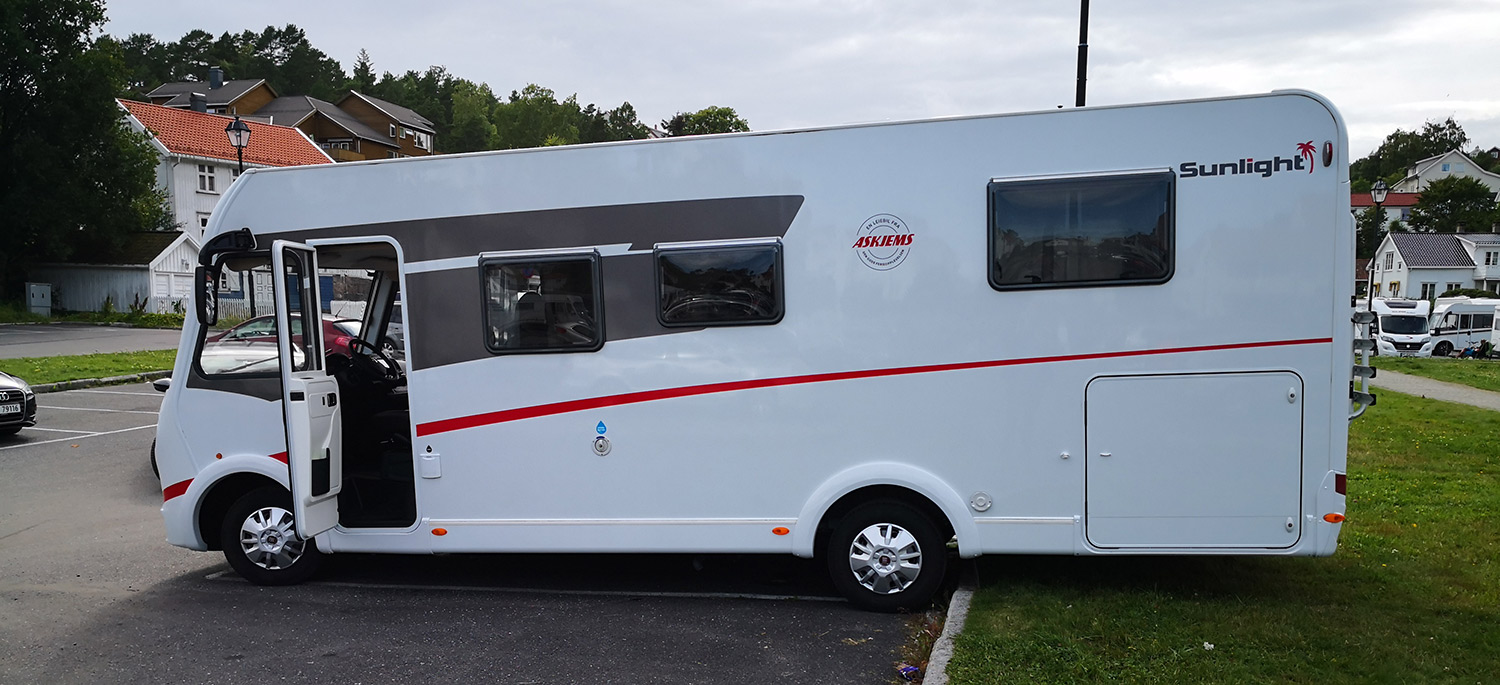The RV was a Sunlight I69, based on a 150 hk Fiat Ducato. Sitting inside it really pointed out how much this was like putting a motor on a camper. It’s quite large with a body that is 2,3m wide and 7.4m long (7.5 x 25 ft). The height is also a bit more than the 3m (10ft) it officially says, but I’ll get to that later. Despite the size, the Fiat Ducato is easy to handle and I got use to it fairly quickly. What took some time to get used to was all the noise. The whole thing feels flimsy? At every turn, the plastic walls will make creaking sounds and it really feels like a caravan with an engine (without any engine sound proofing). We had to blast the stereo at max volume to hear music if driving on a highway. This was really tiresome, so we saved the stereo for smaller roads where the cabin noise was lower.