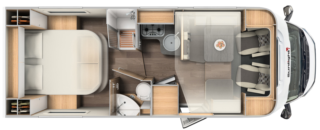 At 7.5m length, the car had accommodation for 5 people. Two in a private bedroom in the back + two kids in an overhead pull-down bunk and one (almost full size) bed that required converting the dinette through a series of odd puzzles. With smaller kids, you could just put both in the bunk. With our kids being 18 & 15 yrs, they really didn’t want to share a bed. No problem, but much more fuzz packing the beds up/down + synchronising getting up in the morning and going to bed.