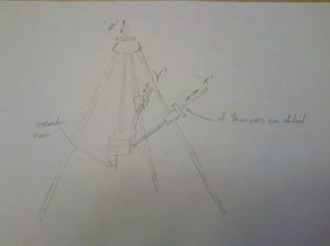 This was loaded into the workbook on September 04. At this point, I do not have a good structural sketch, just a poor pencil drawing. (Sorry!) This concept has two major issues: First the extruder platform tilts during use. While this can probably be corrected with clever use of extra arms and universal joints (something like a parallelogram 4-bar linkage), I still need to work out the details. The second problem is that this design requires more extensive structure, including parts that are longer than the build envelope. This means purchased parts, which cut into both my budget and percentage of printed parts. Currently I think that Concept 1 addresses both these issues adequately. All that said, this design has an advantage in that it requires a relatively small volume of printed parts, and is scalable simply by lengthening the axes and legs!