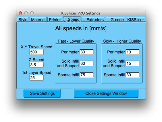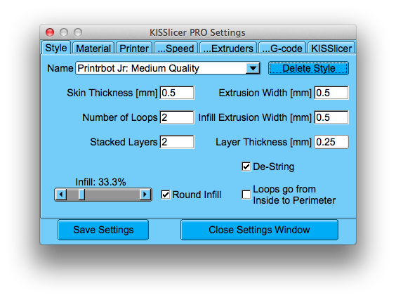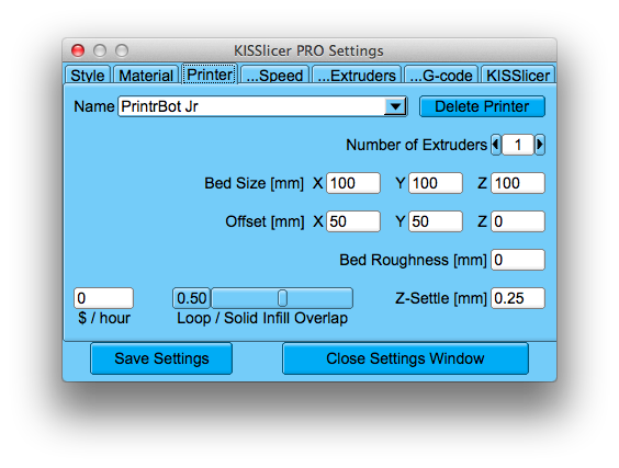 While my Printrbot Jr keeps impressing, the software side is a little less overwhelming. I use Kisslicer with my Ultimaker and setting it up for the Printrbot was quite easy. Kisslicer is a very good slicer that thinks differently than many of the other alternatives such as Skeinforge and Slic3r. I tend to toggle between mutiple slicers, but lately I've more or less settled on Kisslicer. It simply makes better toolpaths and it's easier to work with. It's also easy to set up for use with multiple 3D printers and it's a free download that isn't crippled in any way. Paying the $42 gives you a few "Pro" features, but most user won't need this. I basically just bought a license because I wanted to support the future development.