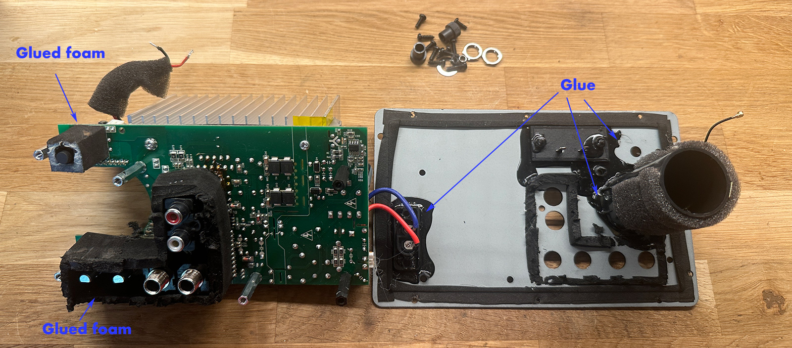 It's just the electronics driving them that are defect so I'll just rip out the amplifier and replace it with a new one! Tearing out the old electronics showed one of the reasons that PreSonus don't offer repairs or support. They've basically built the speakers so they are hard to service. Getting into the case is easy. Just remove screws and you have access. Getting to the electronics is the hard part. Due to the excessive amount of glue and glued foam, the only way you can take this apart is using a knife.