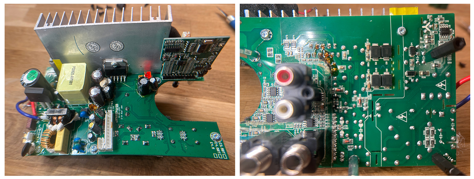 There's absolutely no reason for these foam pads to be glued both to the PCB and the case. Gluing to only one side would allow easy access and a way to replace defect electronics. It's just a very stupid choice that enforces planned obsolescence? After getting the foam apart, it was just a matter of cutting the right cables. The only thing I could reuse in a simple way was the OnOff switch at the front and the only part I found sensible to salvage was the heatsink.