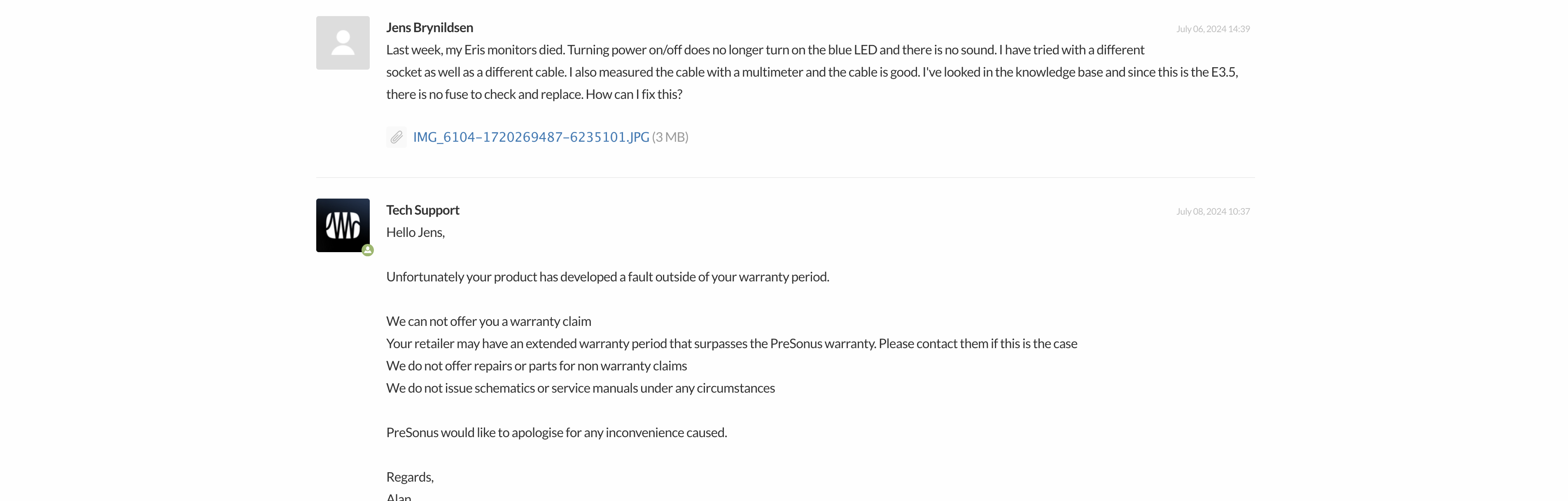 You basically just have to check if the limited warranty has passed and then paste this reply to all customers? They're not saying it explicitly, but they are still telling me to just throw the speakers in the bin? They won't offer any kind of support, parts or even help in the form of a schematic? Electronics like this should last more than 3 years, but when they break - any good firm should offer advice for how to get it repaired? PreSonus don't.