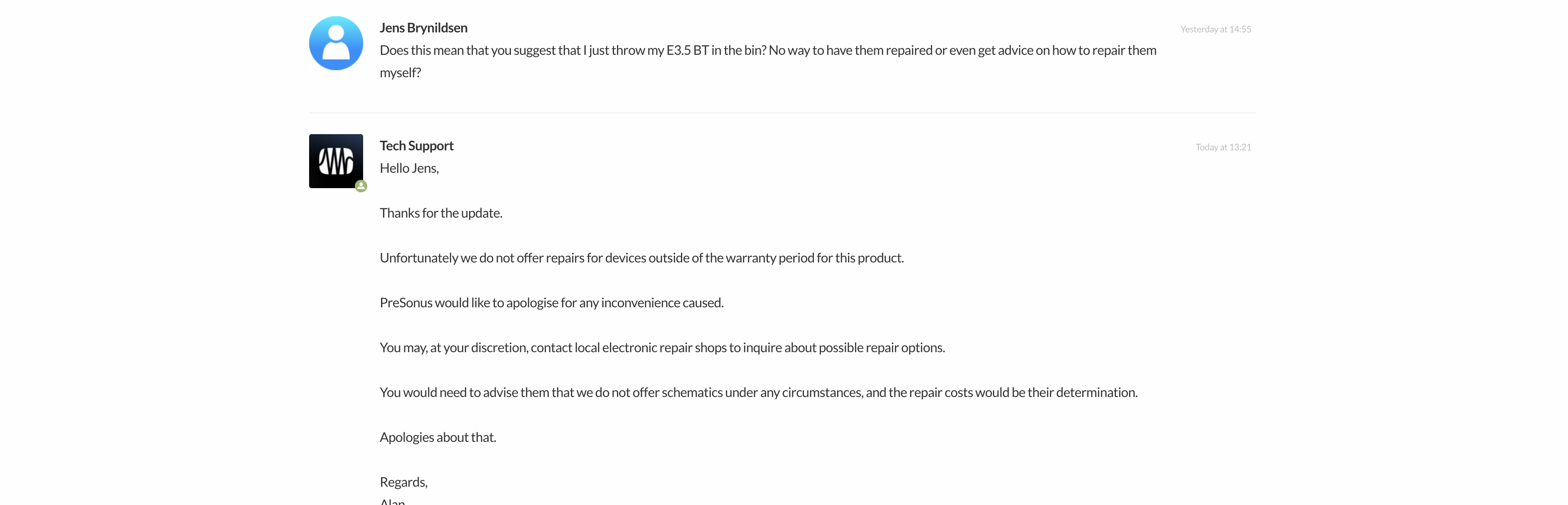 PreSonus cannot repair, supply spare parts, issue schematics or service manuals for the PreSonus Eris 3.5BT speakers I bought 3 years ago. "PreSonus would like to apologise for any inconvenience caused" is written at the end of the message where they basically tell me to throw away a pair of speakers. That is indeed inconvenient?