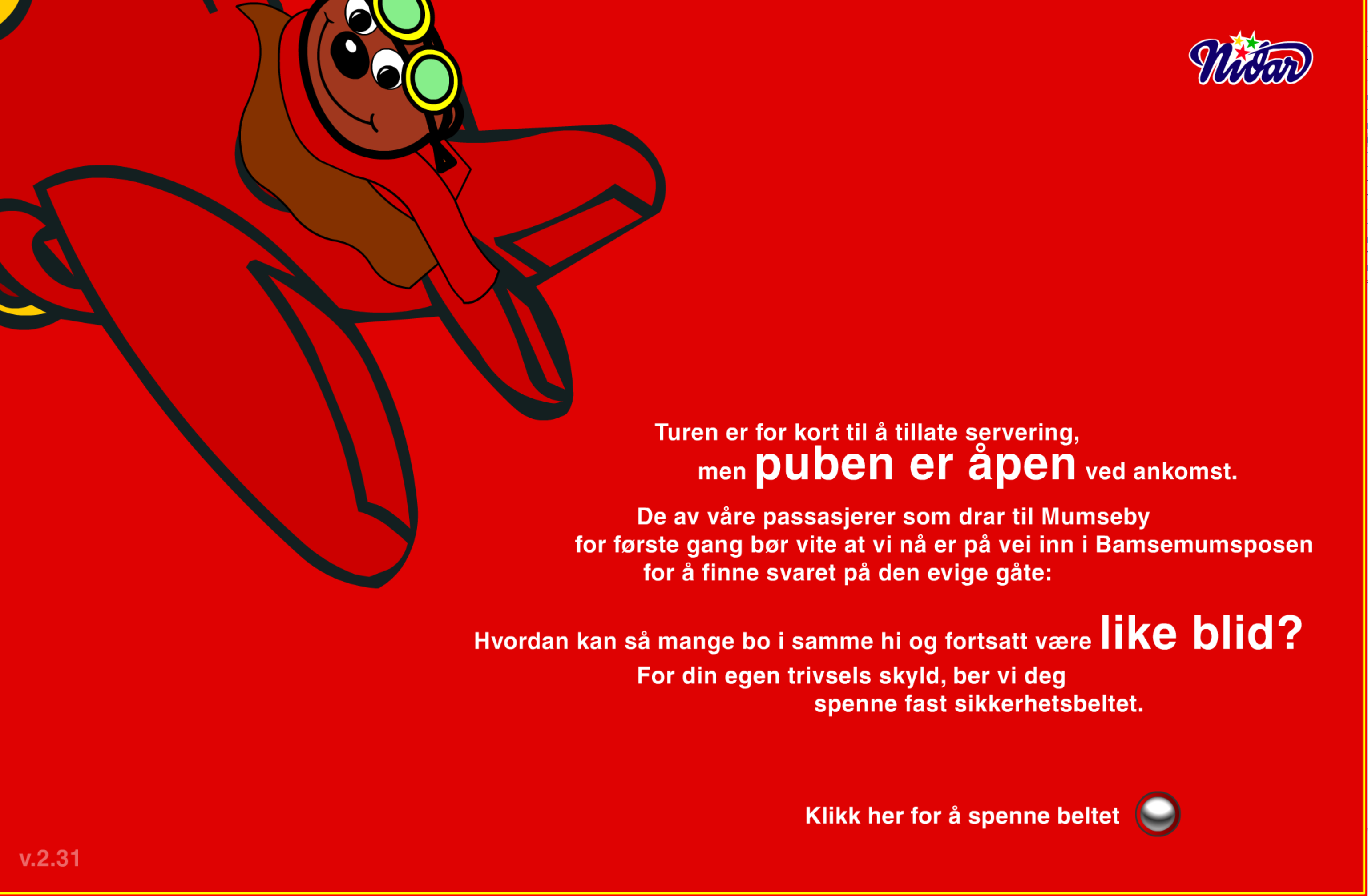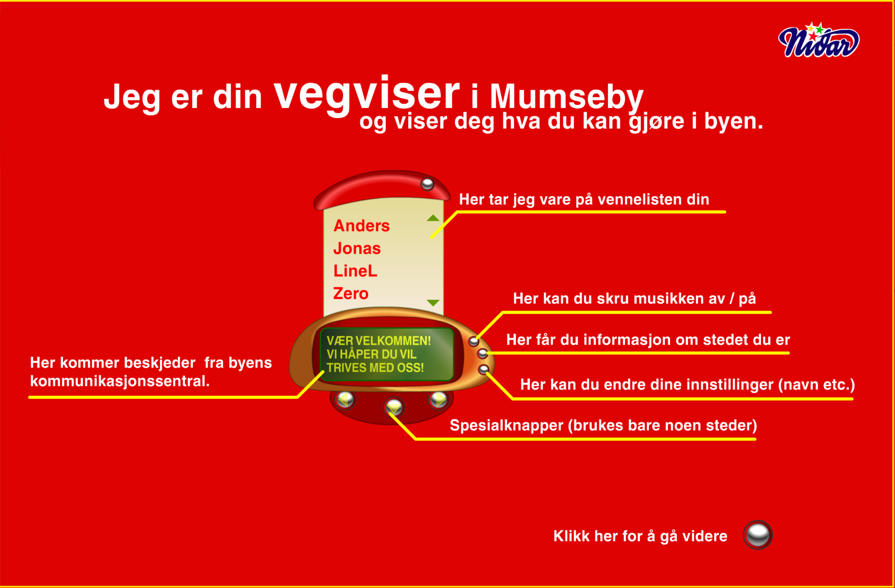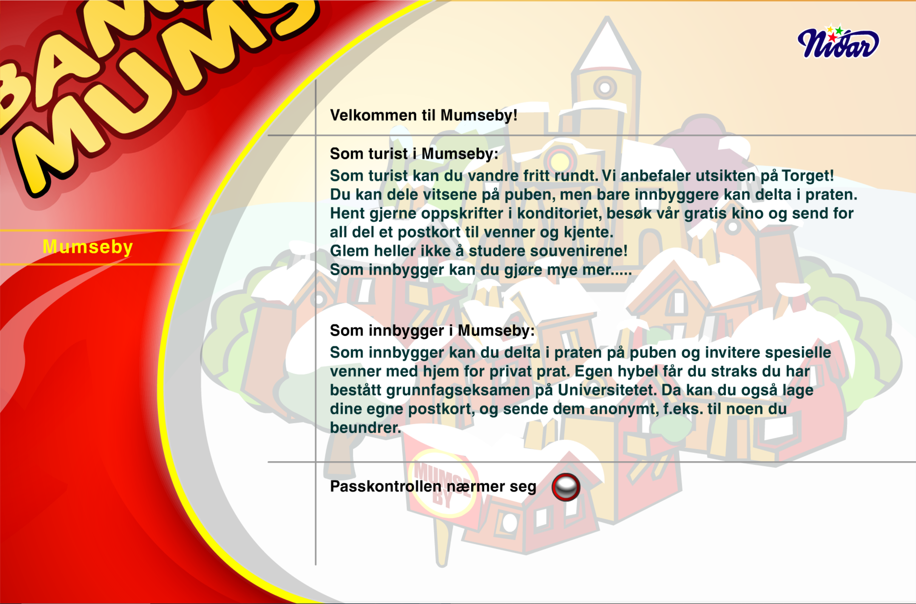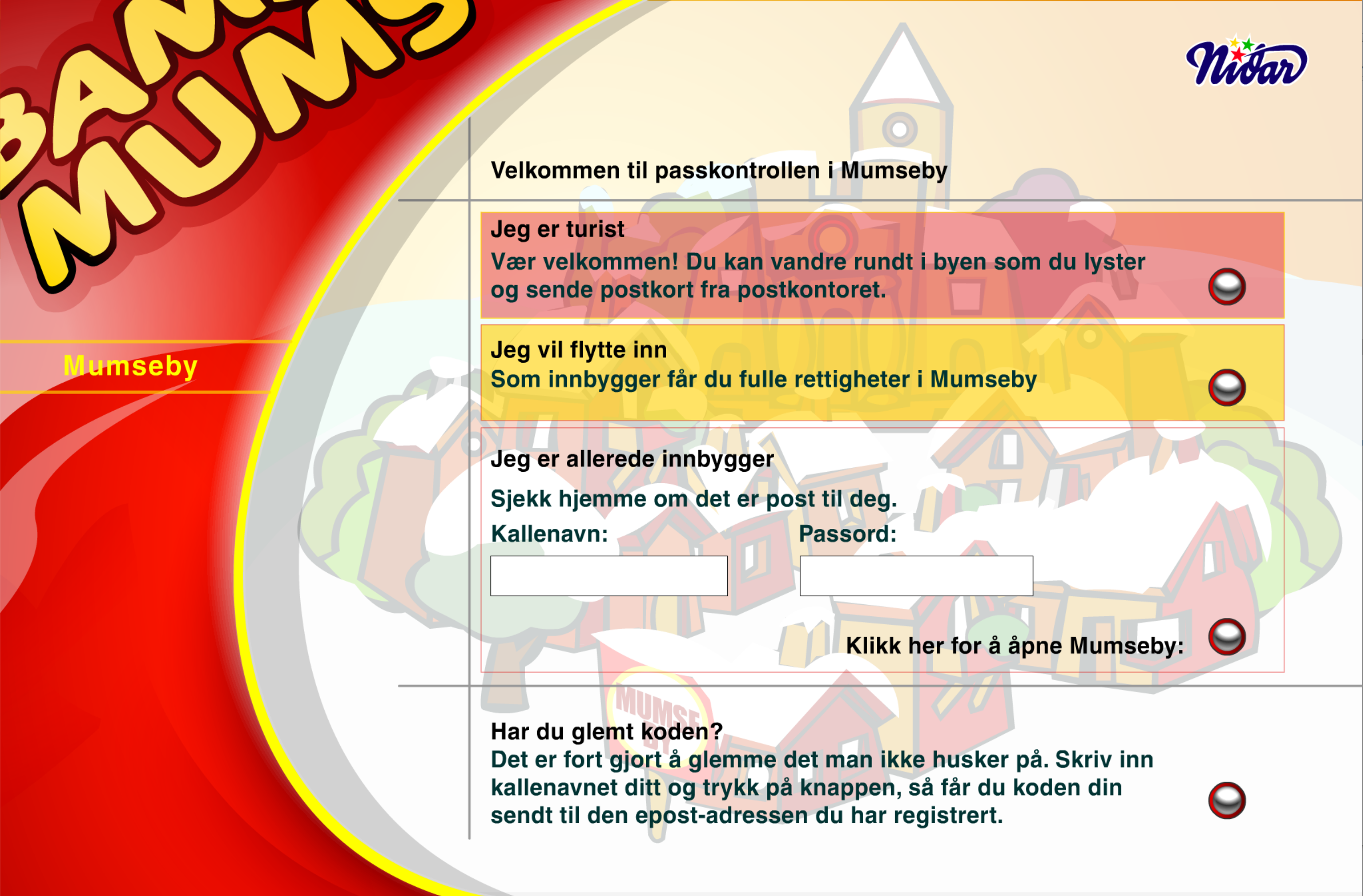 The city was an interactive application hosted on the domain mumseby.no. It popped up as it's own window, so you could keep browsing in the main window with Mumseby on the side. As was common in the days of Flash, some preloading was required. We spent that time showing some initial information about your trip to Mumseby:
