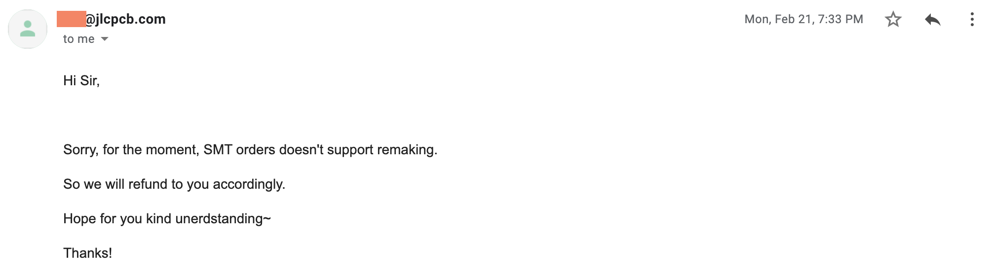 After 5 days of mailing back and forth to avoid a refund, they suddenly sent me 4 boards with the reverse mounted LEDs placed by hand. I really wanted to avoid getting the refund since the hourly wage in Norway for accountants is quite a bit more than in China. If I get a tiny refund, it’ll likely cost me more than it’s worth in terms of accounting and handling of accounting documents.