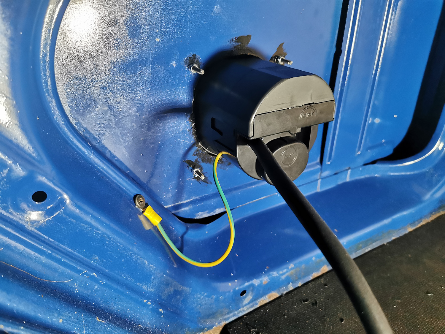After filing the sides of the hole and drilling holes for the four mounting screws, I painted all exposed surfaces with Hammerite metal paint to prevent rust from forming. All screws use nylock nuts so they won’t come loose. I then hooked up the socket with a solid wire going stright to ground from the plug to the car chassis. If you don’t create this connection, you can create some really dangerous situations due to differing ground potentials. When we’ve done more on the interior, we’ll get an electrician to mount a small fuse box and certify the installation since this is required by law in Norway. For now, it is just hooked up to a short outdoor extension cord.