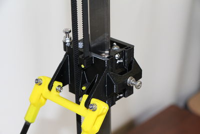 The arm design has been changed slightly from the Rostock design. The arms use a 6mm carbon fibre tube and the tube is glued inside a clevis. That's not too different but the yokes at each end of the arm assembly are intended to simplify assembly and reduce the number of fasteners required. It also give a larger range of motion than the commonly used ball joints.