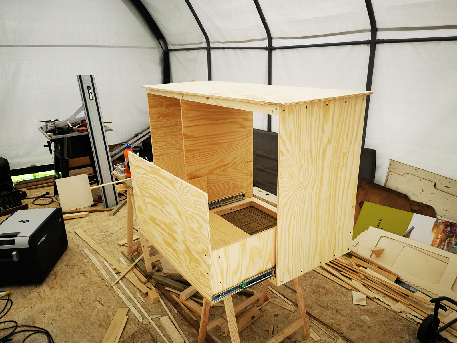The reading lights work great! If you don’t need them, you can just point them upwards, but they’re the right angle if you want to read. They also have builtin USB chargers for convenience and they dim. After this, I got started on the kitchen setup. It’ll hold a Dometic top loaded fridge, our water system, a sink and a flip-top that hides the cooking area. We’ll use a portable burner so we can cook outside if the weather is good.