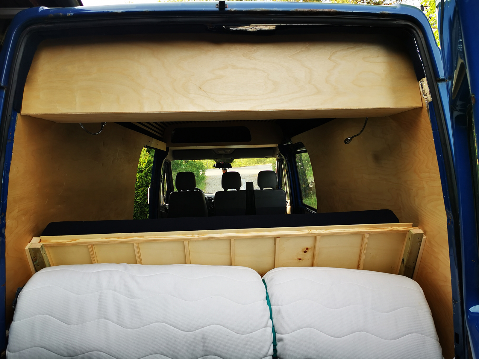 I also made a table of three glued layers of ply with birch on top and poplar at the bottom to save weight. The table is on a Lagoon mount, so it can swivel in all directions as needed. Here’s how it looks with the first two mattresses in.