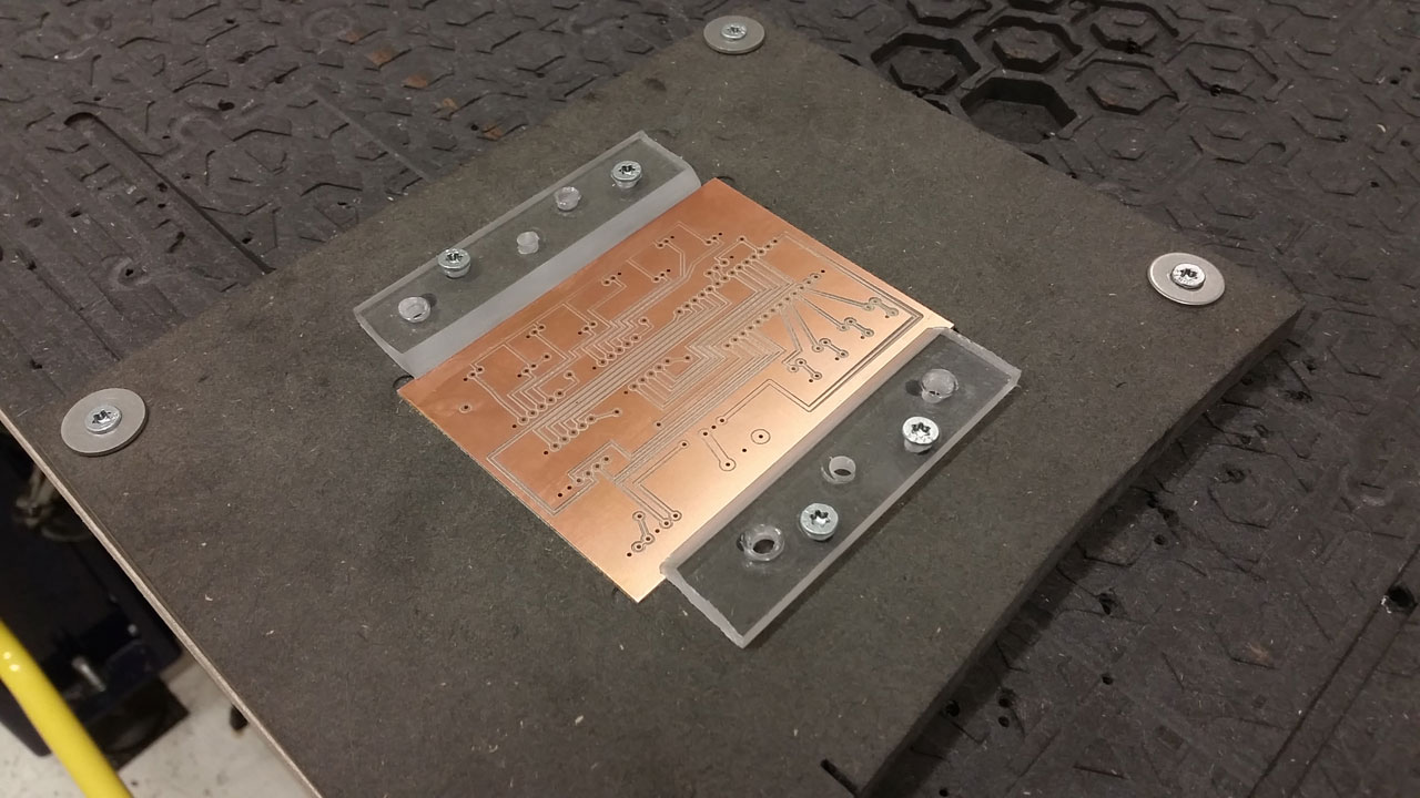 - Put the PCB in the pocket and make either a full frame (slightly smaller than the PCB) or use some small wooden pieces that you the fixate the board with. Don’t over-tighten as that can cause the PCB to become slightly bent giving you uneven