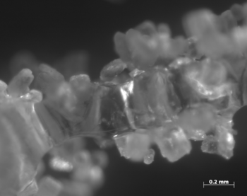 The most successful (though basic) sintering was achieved with a laser power of 2.4 Watts at 125mm/s with ten sequential linear scans, which produce the sintered column in the above magnified images.